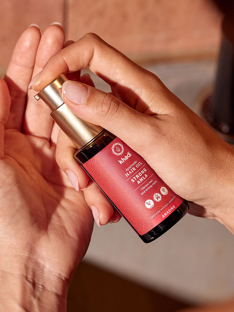 El secreto único de la eficacia de Strong Amla reside en el elixir ayurvédico khadi Amla, un extracto altamente concentrado de plantas medicinales ayurvédicas seleccionadas a mano. Este elixir se basa en una combinación tradicional ayurvédica de hierbas, corteza y frutas. Estas se hierven y se mezclan en un ritual de producción ayurvédica específico hasta que se potencian los mágicos poderes curativos de la naturaleza. La proporción de elixir Khadi en tu aceite capilar khadi es de hasta un 20%, en comparación con solo un 2-5% de ingredientes activos en los aceites capilares convencionales.