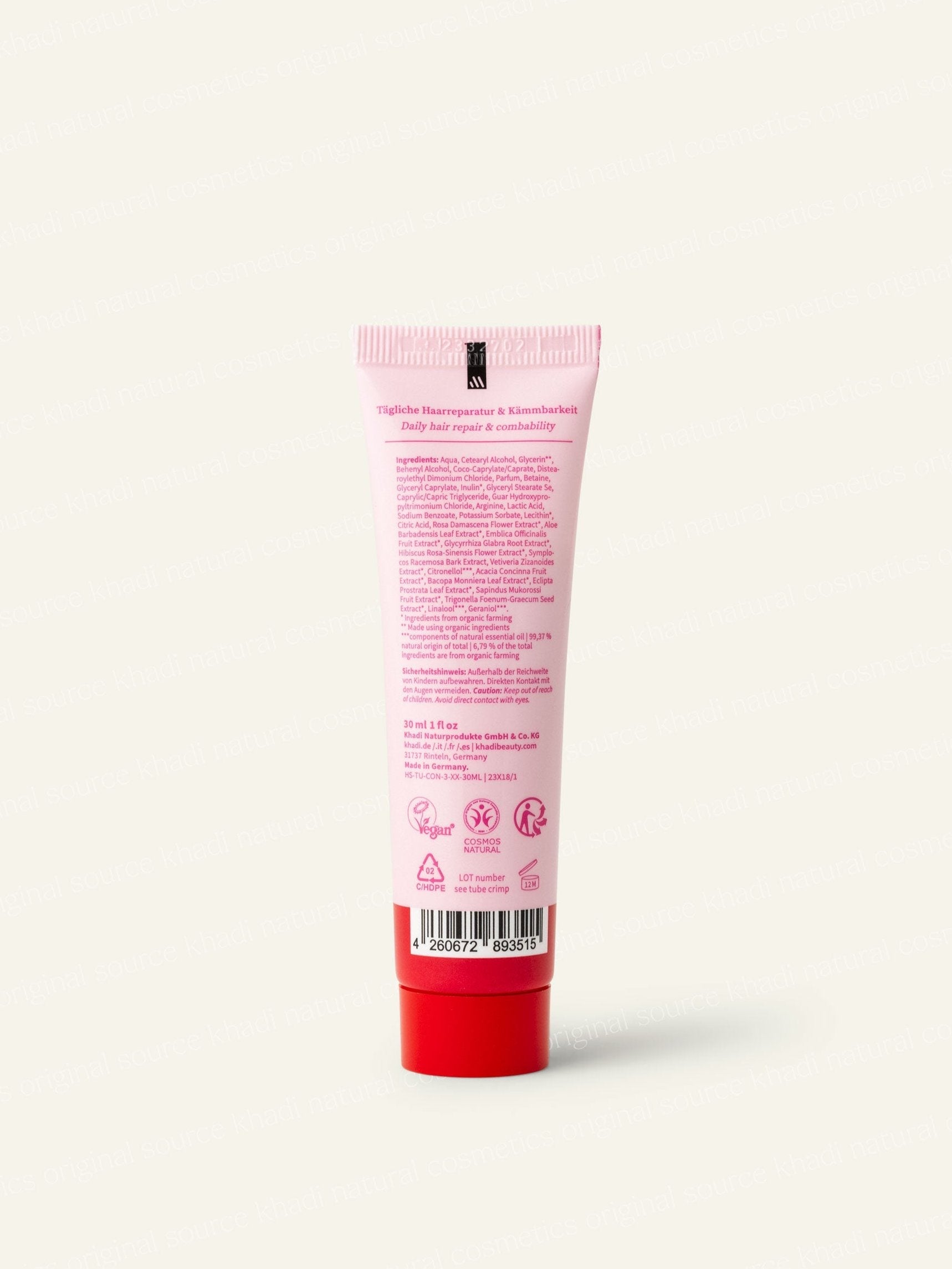 Con el Acondicionador Reparador Rose Revolution, de base Ayurvédica, khadi combina el poder del Ayurveda con la investigación más avanzada en el cuidado capilar. El nuevo Complejo Reparador de Inulina Betaína actúa en conjunto con el Elixir Reparador de Rosas khadi, extraído según la antigua tradición de hierbas medicinales indias seleccionadas a mano, como amla, brahmi, bhringaraj y preciosos pétalos de rosa. Estas hierbas se hierven suavemente y se remueven según los principios de fabricación ayurvédica hasta que se potencian los mágicos poderes curativos de la naturaleza; en Ayurveda, esta "poción mágica" se denomina decocción medicinal. La proporción de Elixir Reparador de Rosas khadi en el acondicionador es de hasta un 20%, en comparación con solo un 2-5% de ingredientes activos en los acondicionadores cosméticos naturales convencionales.
