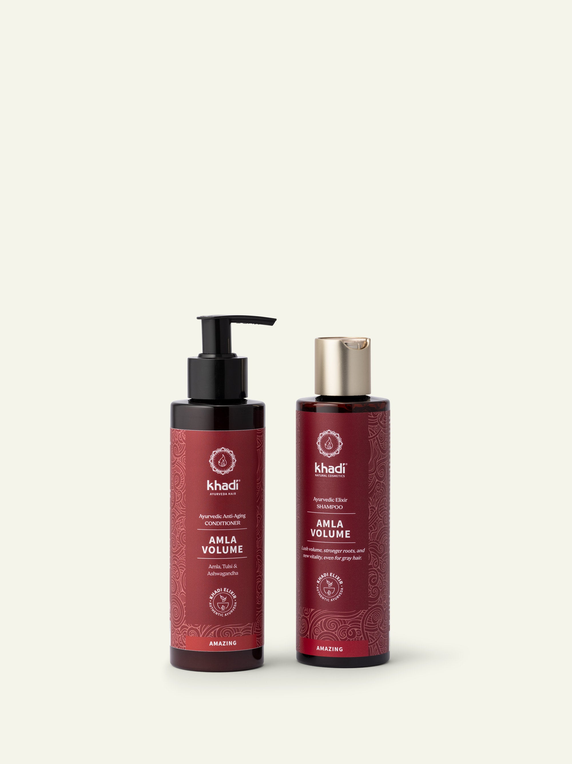 Experimenta el rejuvenecimiento capilar diario según el Ayurveda: El Set de Cuidado Diario Antiedad khadi combina una limpieza suave y un cuidado intensivo en un ritual para un cabello visiblemente vital y fuerte.