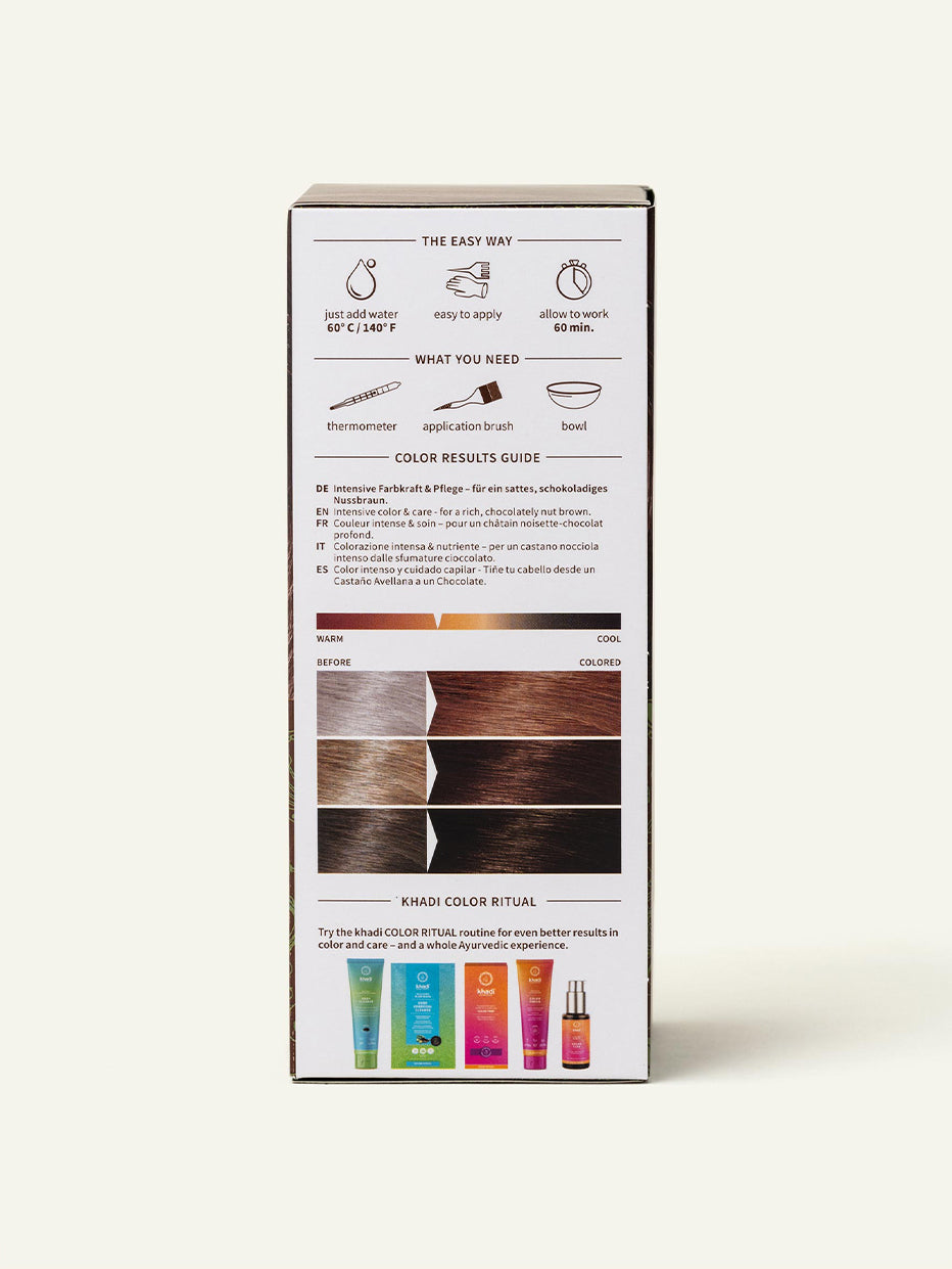khadi Castaño Avellana es ideal para la coloración permanente y revitalizará tu cabello de forma natural, dándole una vitalidad saludable. El resultado final depende del color natural de tu cabello.