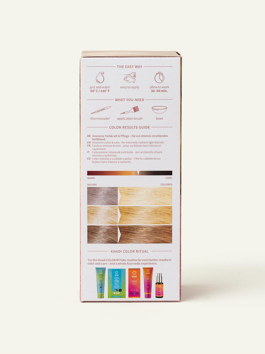 khadi Rubio Claro es ideal para la coloración permanente y restaura la vitalidad de tu cabello de forma natural. El resultado final depende de tu color natural original.