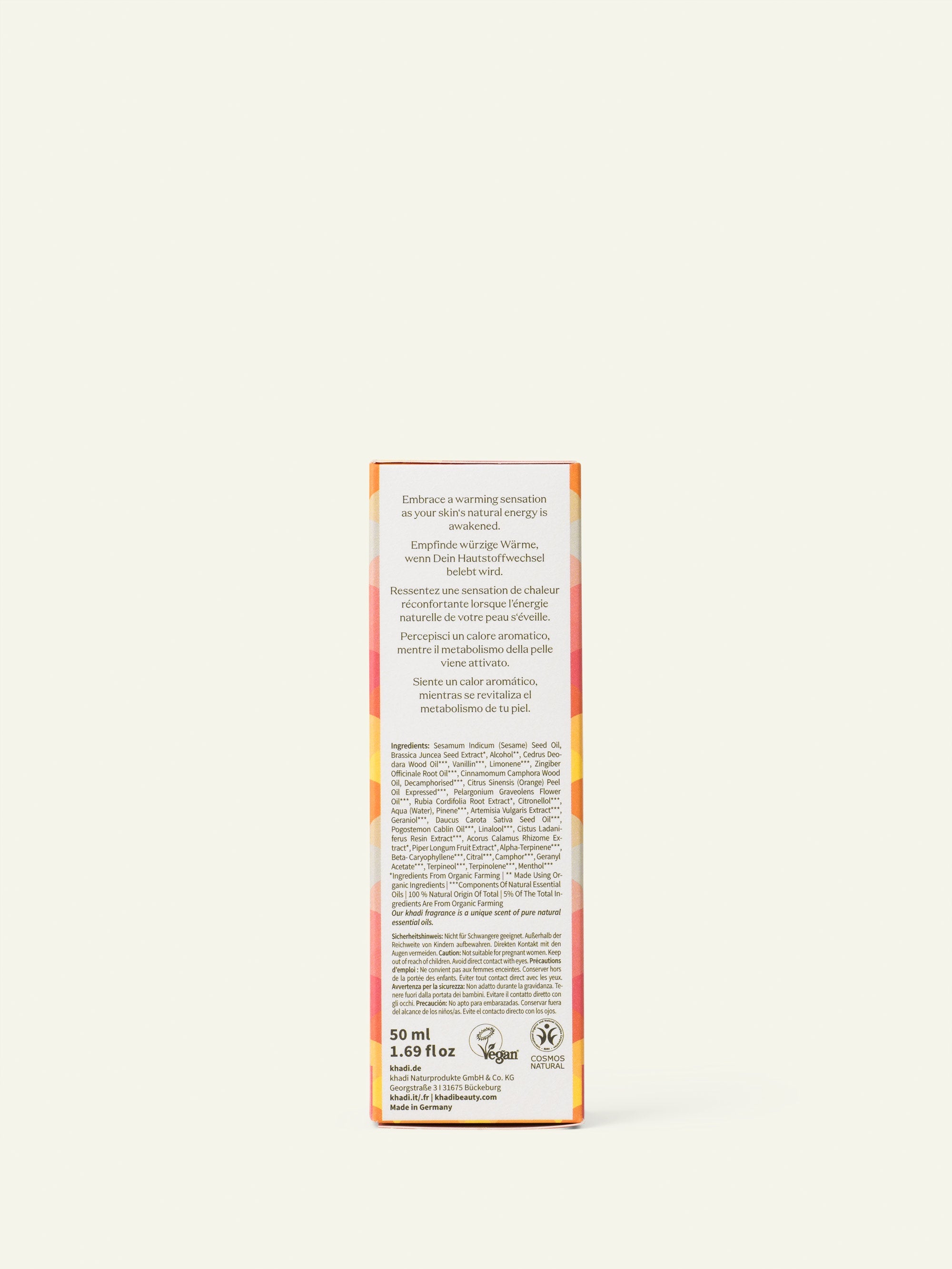 El fuego ayurvédico de la transformación: Con Spicy Cell-Lite khadi, las células de tu piel experimentan una transformación intensa para una piel suave y tersa. Gracias a su potente fórmula y propiedades de calentamiento, este tratamiento estimula activamente el metabolismo de la piel. Esto ayuda a reducir de forma natural los depósitos de grasa y las células muertas, dejando la piel visiblemente más suave. Spicy Cell-Lite khadi, una auténtica fuente de energía líquida para tu piel y, gracias a su refinado aroma especiado, una experiencia sensorial única.