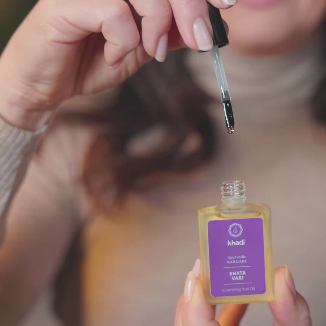 Cuidado Ayurvédico para unas uñas fuertes y elásticas y unas cutículas suaves: el aceite nutritivo para uñas khadi Shatavari combina el poder de los valiosos aceites vegetales prensados en frío con un elixir Ayurvédico de 7 hierbas y raíces medicinales, como shatavari, ashwagandha, amla y malva india. La composición de 5 aceites de almendra, jojoba, girasol, sándalo y germen de arroz nutre intensamente, hidrata y mantiene la suavidad de las cutículas.
