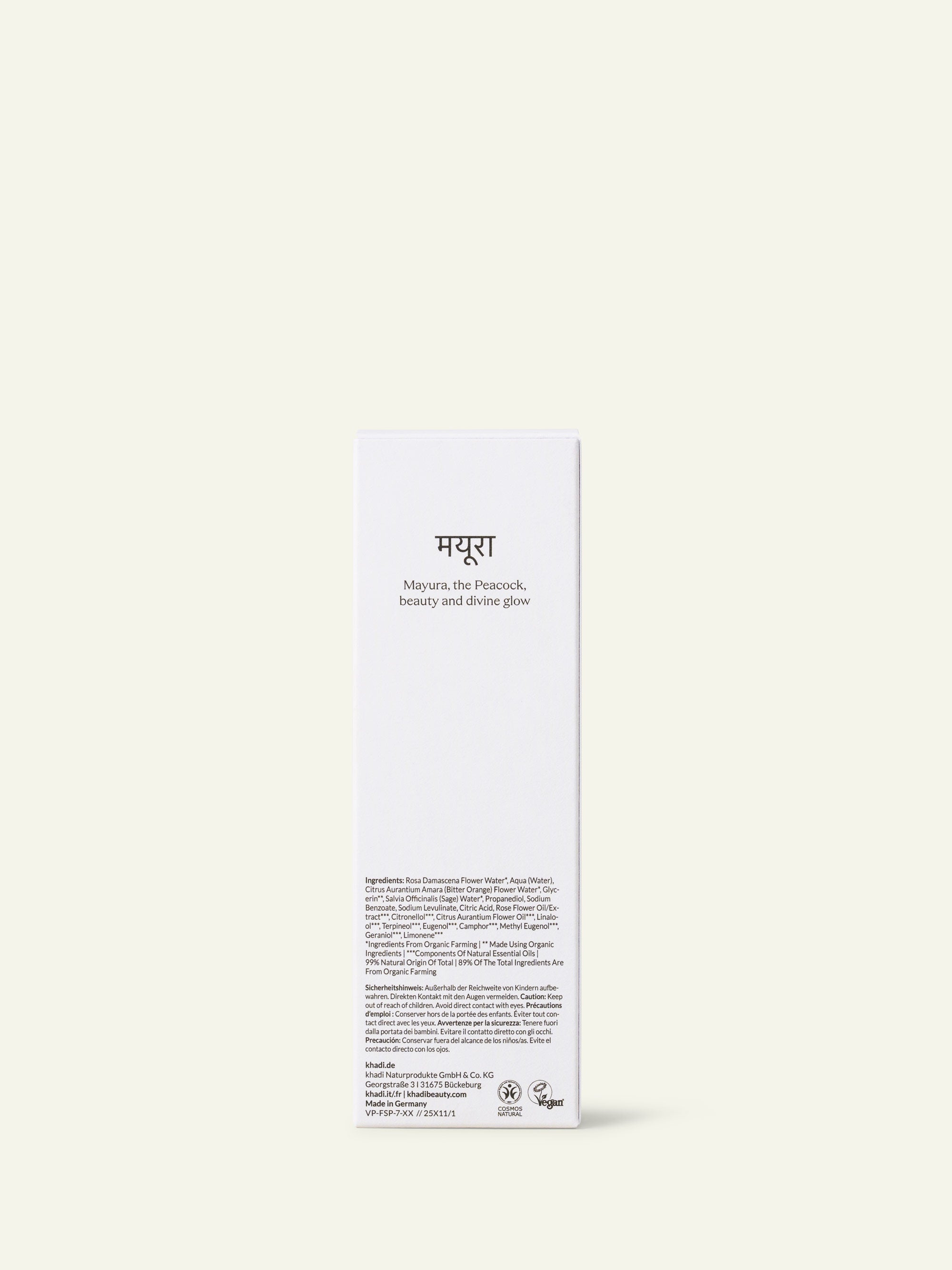Tónico Hidratante Mayura Glow: la sublime belleza del pavo real para una tez llena de armonía y luminosidad. El pavo real, Mayura en sánscrito, es el animal espiritual khadi de este spray hidratante facial. Representa pureza, elegancia y renovación constante. Estas son precisamente las cualidades que este tónico otorga a tu piel cuando anhela hidratación, luminosidad y energía renovada. El Tónico Mayura Glow prepara la piel de forma óptima para la aplicación del Sérum Mayura Glow. De esta manera, los valiosos ingredientes activos ayurvédicos penetran profundamente en la piel.